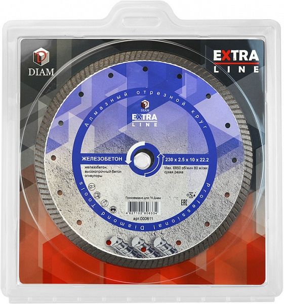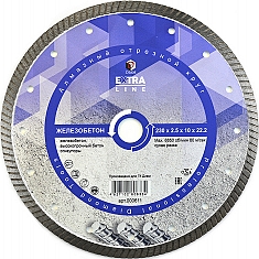 Алмазный отрезной круг Diam Extra Line Turbo Железобетон 230 мм (Диам Экстра Лайн Турбо Железобетон 230 мм) – профессиональный алмазный диск тип Turbo для сухой резки высокоармированного бетона (железобетона), высокопрочного тяжелого мелкозернистого бетона, кирпича, клинкера и других огнеупоров.