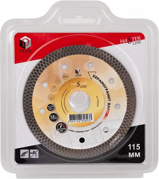 Алмазный отрезной круг Diam Master Line Turbo Керамогранит Rapid 115 мм (Диам Мастер Лайн Турбо Керамогранит Рапид 115 мм) – специальный алмазный диск для резки керамогранита на ручном электроинструменте без применения водяного охлаждения. Отличный вариант для работы с керамогранитом как для прямолинейной резки, так и резки под различными углами.