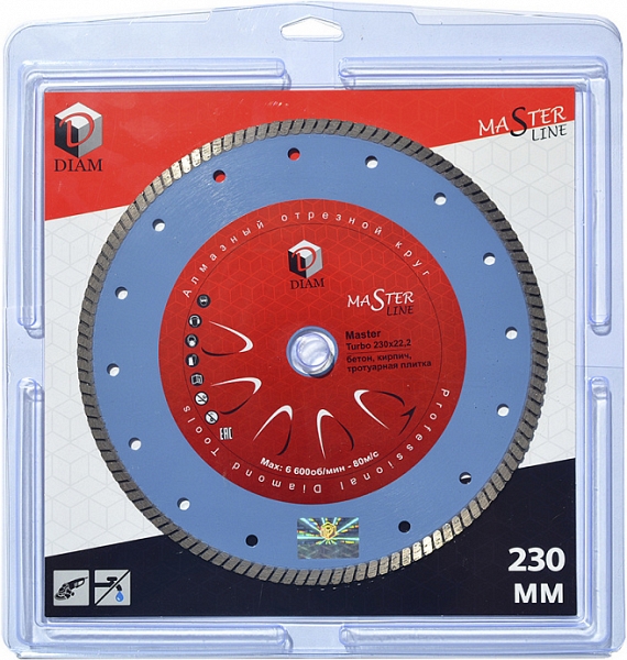 Алмазный отрезной круг Diam Master Line Turbo Master 230 мм (Диам Мастер Лайн Турбо Мастер 230 мм) – профессиональный алмазный диск для сухой резки бетона, слабоармированного бетона, огнеупоров, кирпича, тротуарной плитки, общестроительных материалов.
