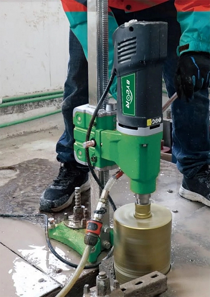 Бесщеточная установка алмазного бурения Bycon Uni-250B (Байкон Уни-250) предназначена для сверления отверстий Ø до 252 мм в бетоне, железобетоне, кирпиче, камне и других материалах, под углом до 45°, с подачей воды, для профессионального использования.