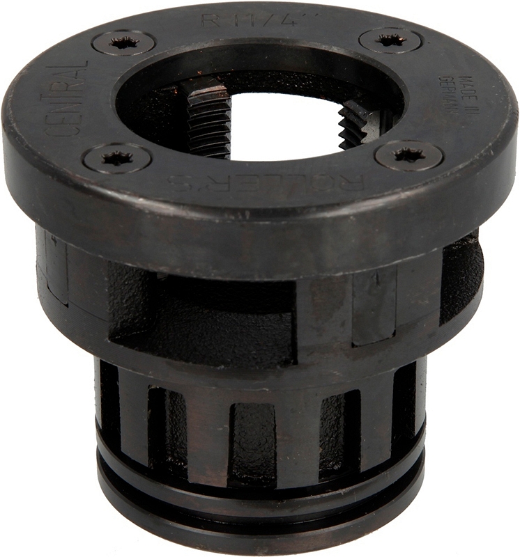 Быстросменная резьбонарезная головка Roller Central R 1 1/4" (Роллер Централ Р 1 1/4") предназначена для нарезки правой трубной конической резьбы R, согласно ISO 7-1, EN 10226 (DIN 2999, BSPT) на стальных трубах Ø 1 1/4" с применением ручных и электрических резьбонарезных трубных клуппов Централ, Кинг 1 1/4", Кинг 2".