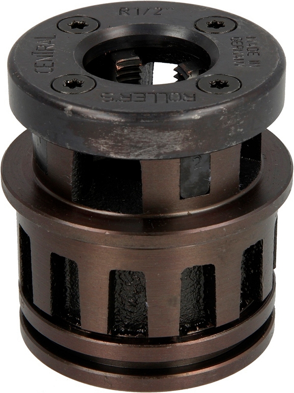 Быстросменная резьбонарезная головка Roller Central R 1/2" (Роллер Централ Р 1/2") предназначена для нарезки правой трубной конической резьбы R, согласно ISO 7-1, EN 10226 (DIN 2999, BSPT) на стальных трубах Ø 1/2" с применением ручных и электрических резьбонарезных трубных клуппов Централ, Кинг 1 1/4", Кинг 2".
