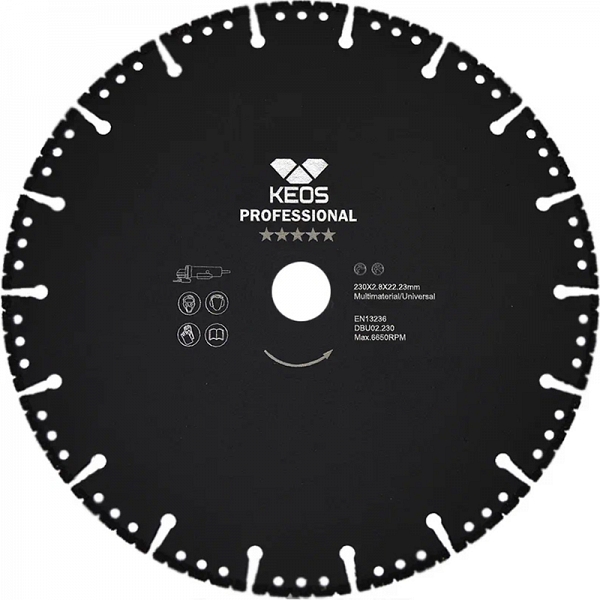 Диск алмазный универсальный Keos Professional 230 мм (Кеос Профессионал 230 мм) предназначен для резки металлов, пластика, резины, бетона, армированного бетона (железобетона), кирпича, древесины и т.д. ушм (болгарками), штроборезами, бензорезами, электрическими резчиками и плиткорезами, стенорезными машинами, как с подачей воды, так и всухую. Подходит для универсального использования, аварийно-спасательных работ и многого другого.