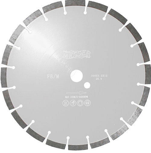 Диск отрезной алмазный Messer FB/M (Мессер ФБ/М) с лазерной наваркой алмазных сегментов предназначен для сухой и мокрой резки высокоармированного железобетона, бетона, гранита, мрамора, каменной кладки, тротуарной плитки, строительных материалов с применением болгарки (УШМ), бензореза, электрореза, швонарезчика, плиткореза электрического, камнерезного станка, стенорезной машины.