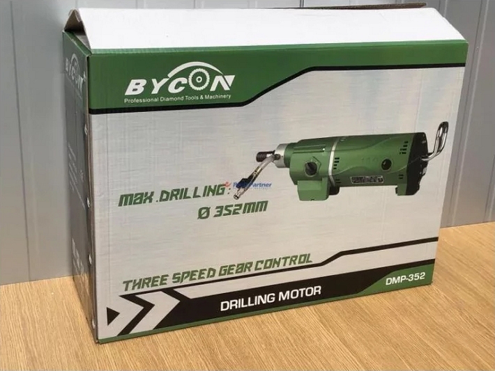 Двигатель для алмазного бурения Bycon DMP-352 (Байкон ДМП-352) – новейший мощный электрический мотор для алмазного сверления отверстий Ø до 402 мм в железобетоне, для профессионального использования, оснащенный трехскоростным редуктором, предохранительным сцеплением и LCD-монитором.