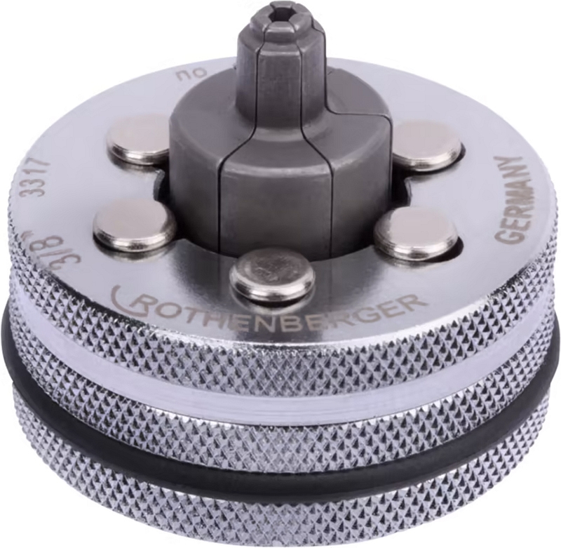 Экспандерная головка Rothenberger Rolock 3/8"×1 мм (Ротенбергер Ролок 3/8"×1 мм) – клепаная расширительная насадка для расширения мягких и полутвердых медных, мягких алюминиевых, мягких прецизионных и инструментальных стальных, мягких нержавеющих стальных труб Ø 3/8", толщиной стенки до 1 мм, для изготовления точных муфтовых соединений в соответствии с нормами DVGW / DIN / ГОСТ и Gas de France.