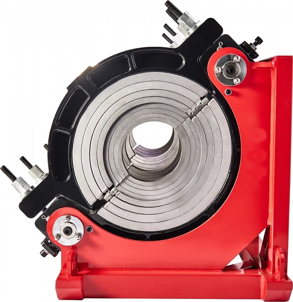 - Центраторо с гидравлическим приводом и 4-мя прочными широкими зажимами, один из которых легко может быть удален для облегчения сварки полимерных фитингов с трубами (тройники, крестовины, отводы), имеет большой запас прочности за счет качественного сплава и ребер жесткости, что позволяет сваривать полимерные трубы с любым показателем SDR
