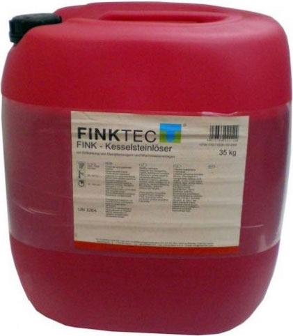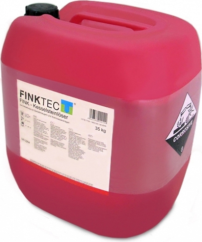 Химическое средство для промывки Finktec FINK-Kesselsteinloser (Финктек ФИНК-Кесселштейнлосер) для кислотной мойки термокамер – замедляющее коррозию средство с биологически активными веществами на основе соляной кислоты, замедлителями коррозии и смачивающими веществами для удаления кальциевых отложений из парогенераторов, паровых котлов и тепловых гидросооружений, раскисление термокамер, камер душирования; для быстрого и эффективного удаления пигментных загрязнений, гидравлической извести, оксидов железа, фосфата кальция и т.д., а также от зарастания биологической пленкой в паровых котлах, тепловых гидросооружениях и для дезинфицирующей промывки систем технической и питьевой воды.