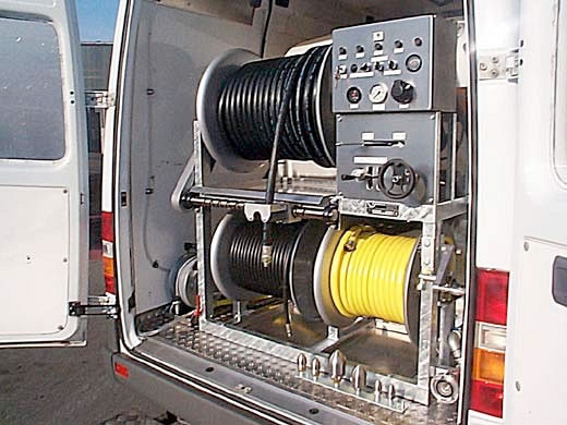 - Прочистка труб от Ø 40 мм. Имеется передвижной барабан со шлангом для труб малых диаметров