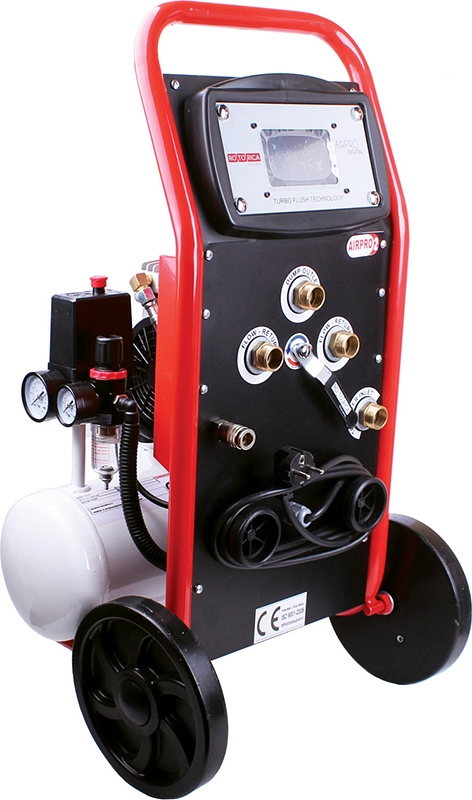Компрессор для промывки системы отопления и водоснабжения Rotorica AirPro Digital (Роторика ЭйрПро Диджитал) – мощный электрический промывочный компрессор с электронным управлением для быстрой и простой промывки и очистки замкнутых систем отопления и водоснабжения водой, водой с пузырьками и химией. Идеально подходит для котлов, водонагревателей, теплообменников, настенных и напольных котлов.