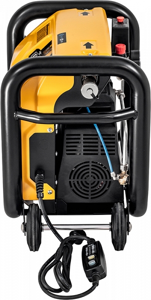 Проверенный мощный безмасляный поршневой компрессор с рычажным приводом и конденсаторным двигателем 230 В, 1500 Вт. Манометр для индикации давления воздуха в ресивере сжатого воздуха. Аварийный выключатель. - Шланги: