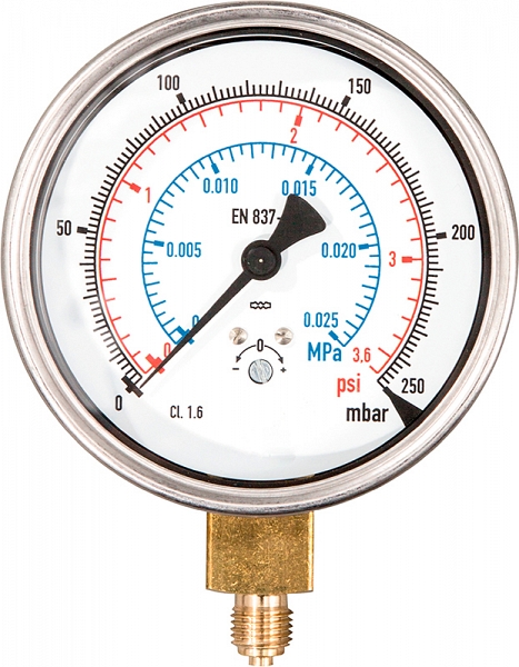 | 115045 | Манометр с точной шкалой, p ≤ 1,6 МПа / 16 бар / 232 фунт/кв. дюйм, для испытания под давлением и проверки герметичности трубопроводных систем и резервуаров до 1,6 МПа / 16 бар / 232 фунт/кв. дюйм. CL 1,0. |