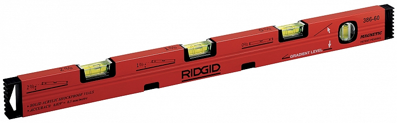 Модель снята с производства! Профессиональный магнитный градиентный уровень Ridgid 386 (Риджид 386) изготовлен из прямоугольного профиля и имеет 3 акриловые противоударные жидкостные ампулы, установленные на 0%, 1% и 2% с точностью 0,5 мм/м или 0,029°. Разработан для универсального выставления наклонов и уклонов.