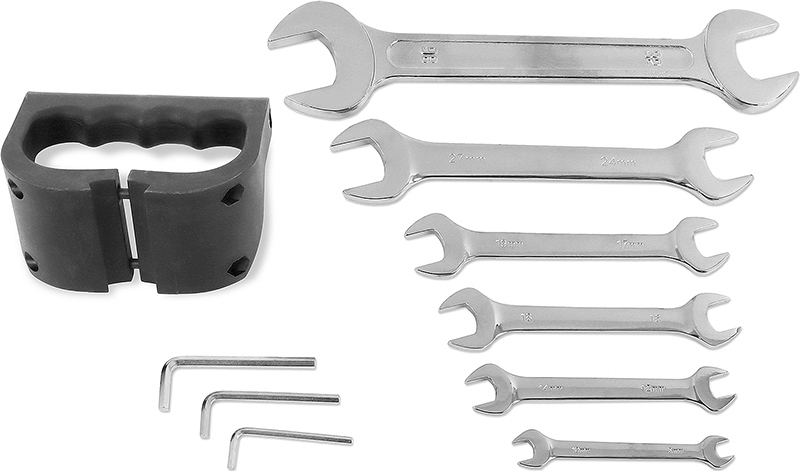 - Комплектуется 4-мя крепежными болтами, 6-тью рожковыми ключами, 3-мя угловыми шестигранными ключами, распорным болтом-головкой, 4-мя юстировочными болтами, рукояткой-штурвалом, дополнительным упором, 2-мя транспортировочными рукоятками, 2-мя быстросъемными плитами, переходной плитой, 3-мя шпонками, 2-мя транспортировочными колесами