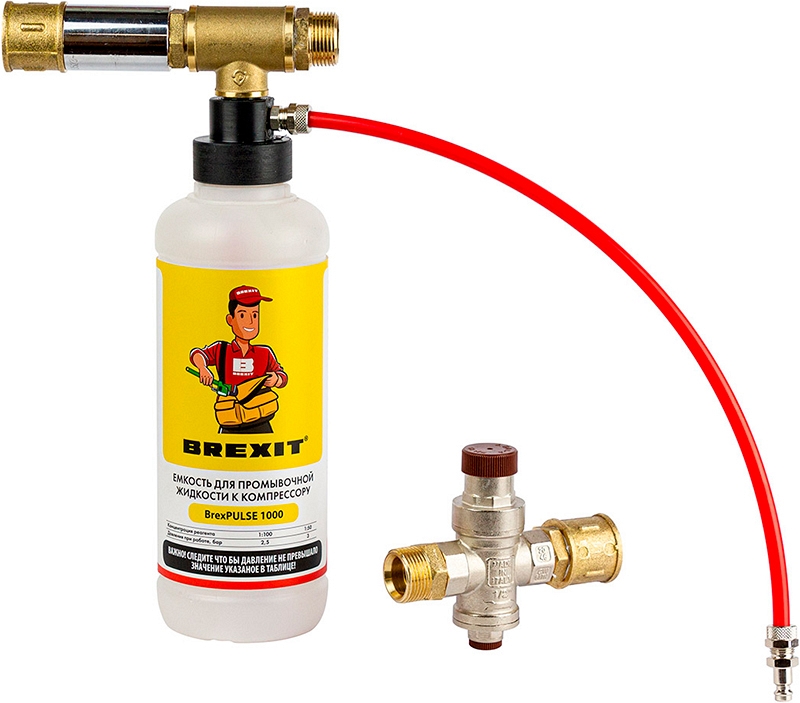 Редуктор, инжектор с емкостью компрессора для промывки системы отопления Brexit BrexPulse (Брекзит БрекзПульс) предназначены для промывки теплообменников; систем отопления, кондиционирования и охлаждения; радиаторов; котлов; бойлеров; водонагревателей; парогенераторов моющими и дезинфицирующими химическими средствами с использованием промывочных компрессоров.