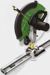 – Для выполнения резки режущая часть при помощи запатентованной быстросъемной системы крепления устанавливается на каретке, расположенной на направляющей шине, и закрепляется простым поворотом ручки