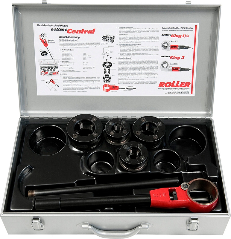 Ручной резьбонарезной трубный клупп Roller Central Set R 1/2"-3/4"-1"-1 1/4" (Роллер Централ Сет Р 1/2"-3/4"-1"-1 1/4") предназначен для нарезки правой конической трубной резьбы R, согласно ISO 7-1, EN 10226 (DIN 2999, BSPT), на стальных трубах Ø 1/2", 3/4", 1", 1 1/4".
