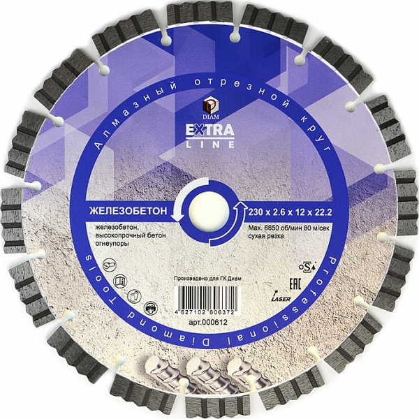 Сегментный алмазный круг Diam Extra Line 1A1RSS Turbo Железобетон 230 мм (Диам Экстра Лайн 1А1РСС Турбо Железобетон 230 мм) – профессиональный алмазный отрезной диск с лазерной сваркой сегментов для сухой резки железобетона, старого высокопрочного бетона, клинкера, огнеупоров и других твердых материалов на болгарках (ушм), штроборезах, бензорезах, электрических резчиках и плиткорезах, ручных стенорезных машинах, без водяного охлаждения.