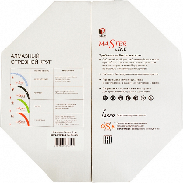 Сегментный алмазный круг Diam Master Line 1A1RSS Универсал 230 мм (Диам Мастер Лайн 1А1РСС Универсал 230 мм) – специальный алмазный отрезной диск с лазерной сваркой сегментов для сухой и мокрой резки бетона, тротуарной плитки, кирпича, черепицы, песчаника, природного и искусственного камня, строительных материалов общего назначения на углошлифовальных машинах (ушм, болгарках), штроборезах, системах резки крупноформатной плитки, бензорезах, электрических резчиках и плиткорезах, ручных стенорезных машинах, с подачей и без подачи воды.