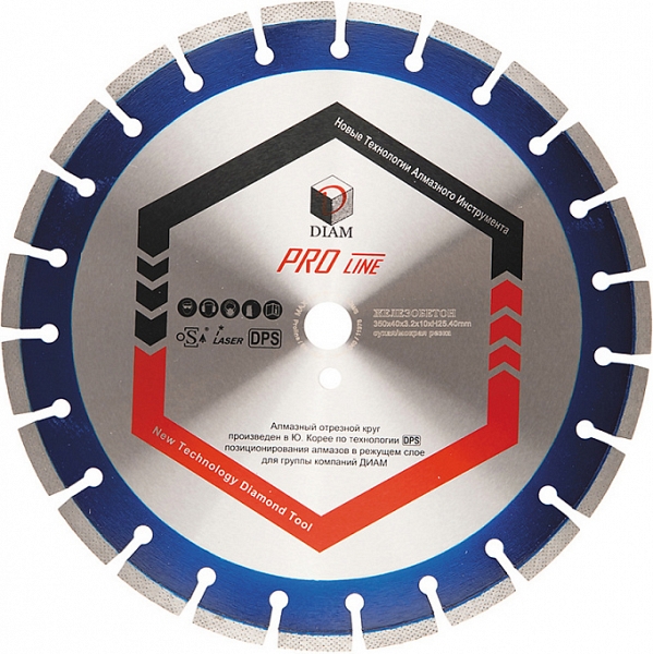 Сегментный алмазный круг Diam Pro Line 1A1RSS Железобетон 350 мм (Диам Про Лайн 1А1РСС Железобетон 350 мм) – профессиональный алмазный отрезной диск с лазерной сваркой сегментов, произведенный по технологии DPS – позиционирования алмазов в режущем слое, для сухой и мокрой резки железобетона, старого высокопрочного бетона, огнеупоров на бензорезах, электрических резчиках, камнерезных станках, стенорезных машинах, швонарезчиках, как с охлаждением, так и без.