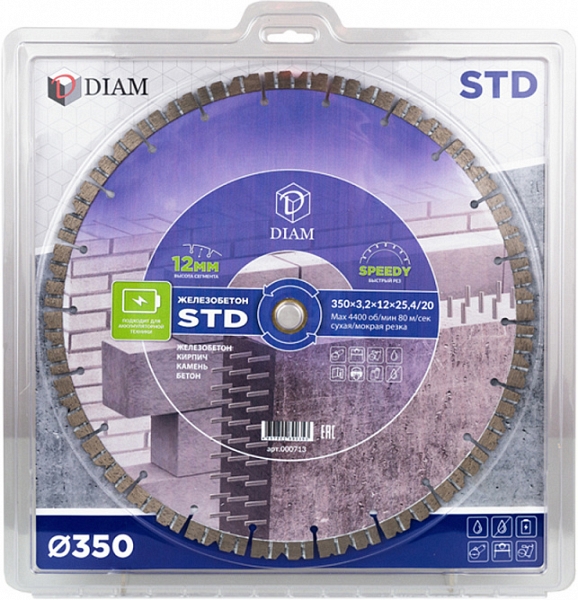Сегментный алмазный круг Diam STD 1A1RSS Turbo Железобетон 350 мм (Диам СТД 1А1РСС Турбо Железобетон 350 мм) – профессиональный алмазный отрезной диск для сухой и мокрой резки железобетона, бетона, камня, кирпича на бензорезах, электрических резчиках, камнерезных станках, стенорезных машинах, швонарезчиках, как с водяным охлаждением, так и без водяного охлаждения, в том числе на аккумуляторной технике.