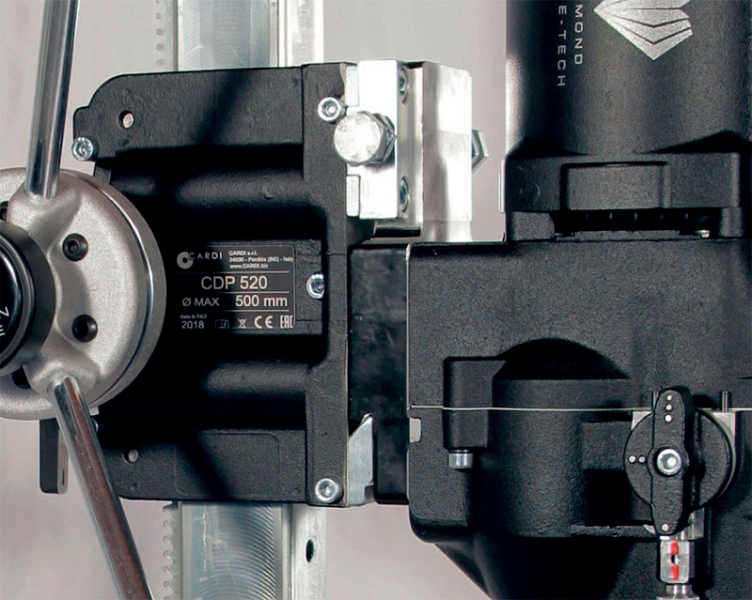 Станина для алмазного бурения с микроударом Cardi CDP 520 (Карди ЦДП 520) – специальная сверлильная стойка для двигателя DPH 3500 SE с системой микроудара для сверления отверстий Ø до 500 мм алмазными коронками под углом от 0° до 75°! Система сухого алмазного сверления без воды – это решение целого ряда технологических задач, ранее невозможных или вызывающих множество проблем.