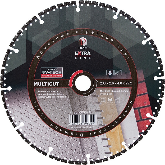 Универсальный алмазный круг Diam Extra Line V-Tech Multicut 230 мм (Диам Экстра Лайн В-Теч Мультикат 230 мм) – специальный алмазный отрезной диск для сухой резки широкого спектра материалов, таких, как: камень, керамика, кирпич, бетон, железобетон, металл, дерево, пластик и многих других.