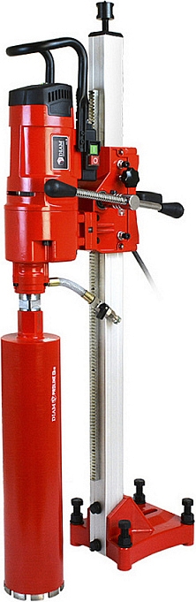Установка для алмазного бурения Diam ML-180NDC (Диам МЛ-180НДЦ) – мощная односкоростная сверлильная машина с ненаклонной (прямой) стойкой для сверления отверстий в бетоне и железобетоне Ø 20 – 160 мм, кирпичной кладке и других строительных материалах Ø 20 – 180 мм, под прямым углом, с подачей воды.
